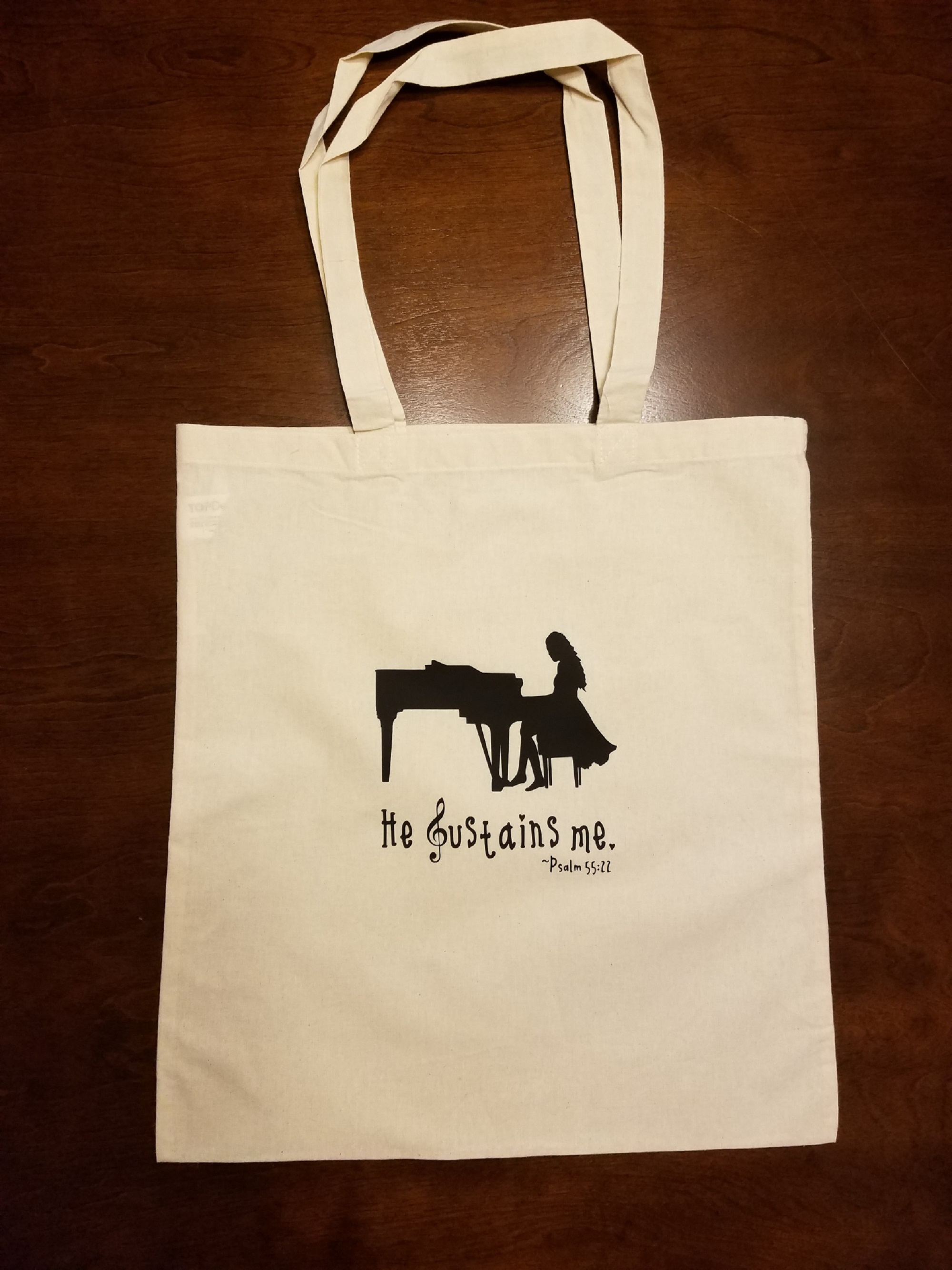 “He Sustains Me” tote bag to carry music, books, or anything else! 16″x15″ natural color cotton tote bag Black print of piano, player, and Psalm 55:22 Best to spot clean